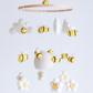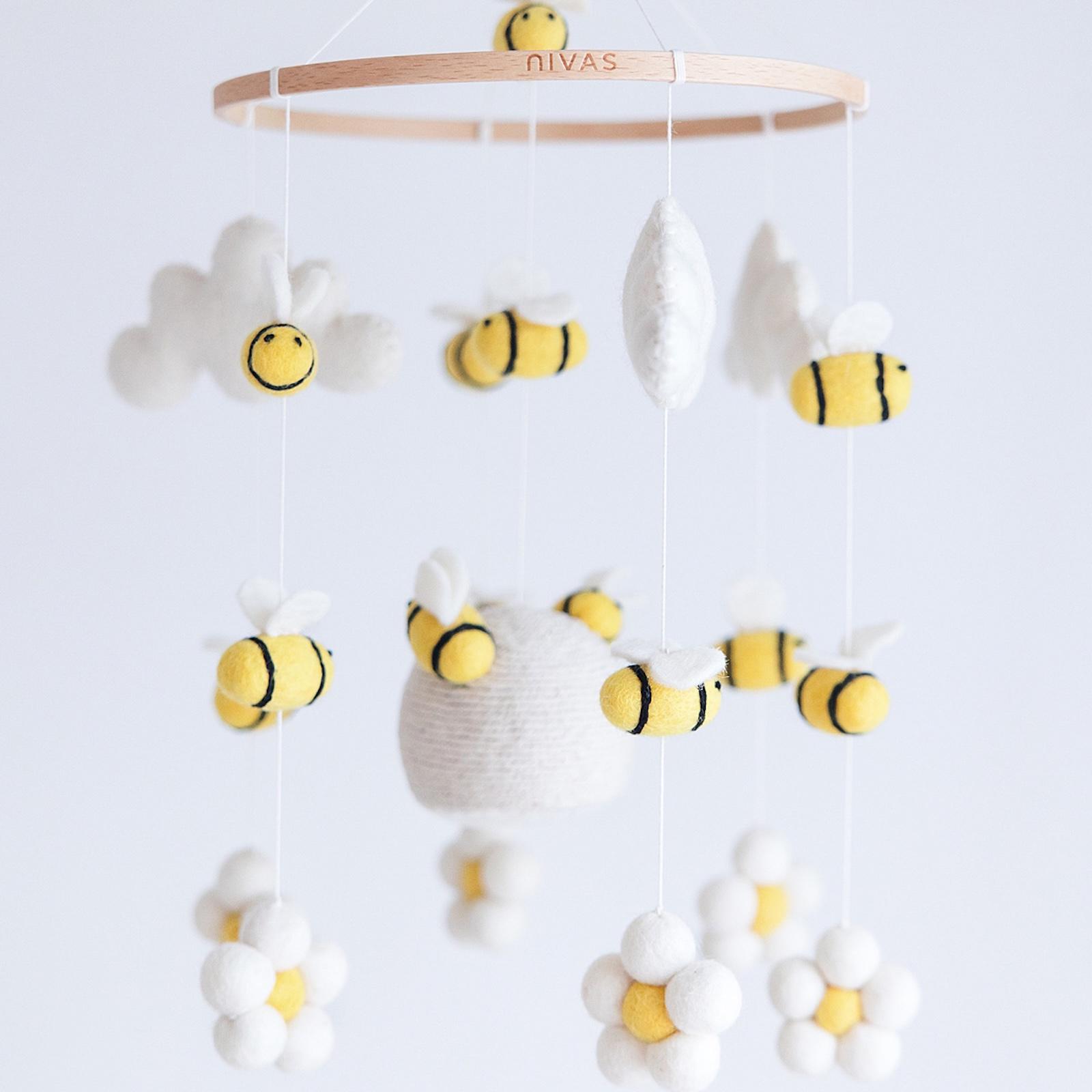 Add a cheerful and nature-inspired touch to your baby’s nursery with this handmade bee baby mobile. Featuring sweet bees and soft natural elements, this crib mobile creates gentle overhead movement while complementing bee theme nurseries, garden nurseries, nature nurseries, and gender-neutral baby rooms. Each handmade nursery mobile is Fair Trade certified and comes ready to hang with a sturdy cotton loop for easy display above a crib, bassinet, or changing table. Additional hanging hardware or crib arm not included. Due to the handmade nature of this baby mobile, colors and sizes may vary slightly, making each piece unique.