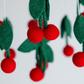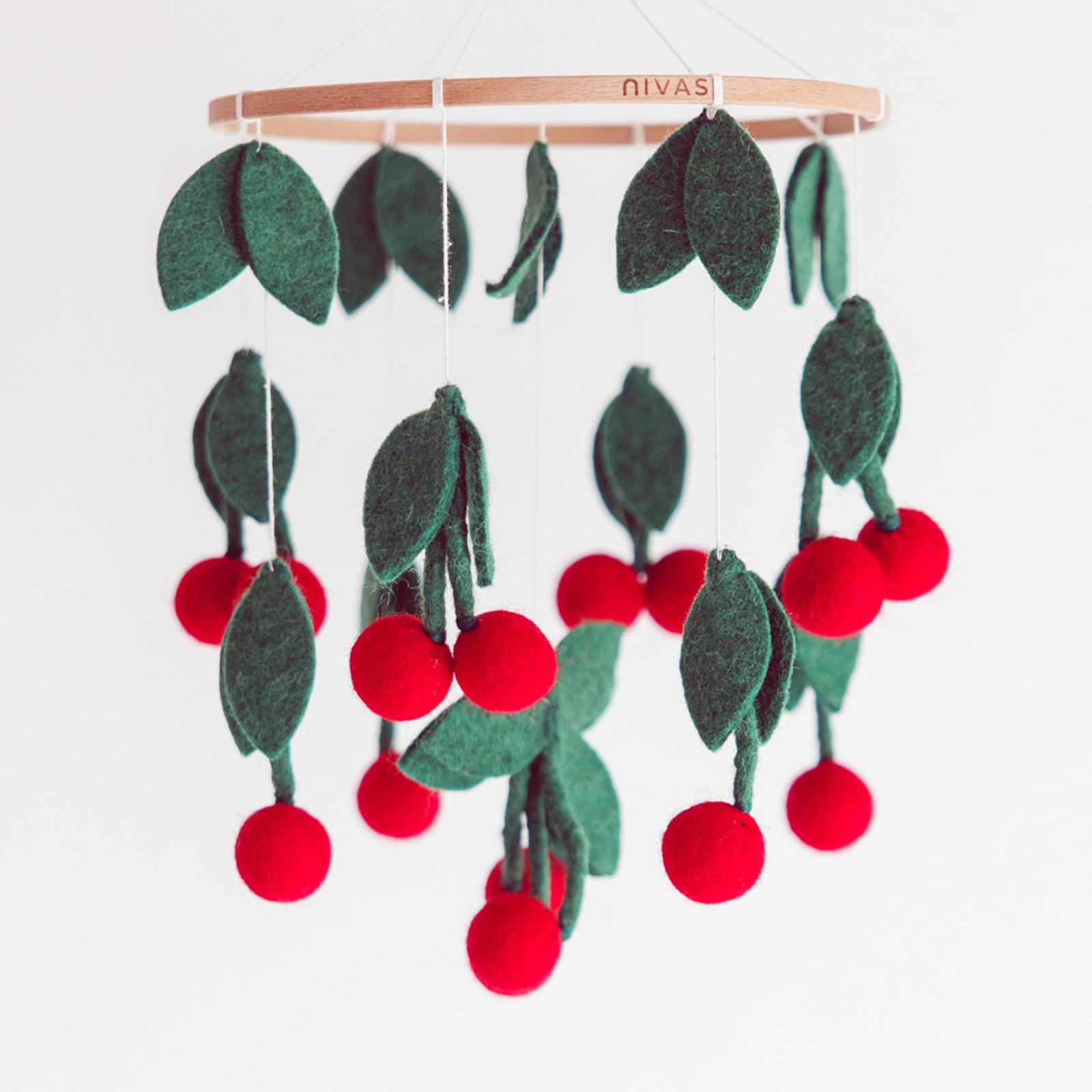 Add a sweet and playful accent to your baby’s nursery with this handmade cherry baby mobile. Featuring bright cherries and soft nature-inspired elements, this crib mobile creates gentle overhead movement while complementing fruit theme nurseries, garden nurseries, and gender-neutral baby rooms. Each handmade nursery mobile is Fair Trade certified and comes ready to hang with a sturdy cotton loop for easy display above a crib, bassinet, or changing table. Additional hanging hardware or crib arm not included. Due to the handmade nature of this baby mobile, colors and sizes may vary slightly, making each piece unique.
