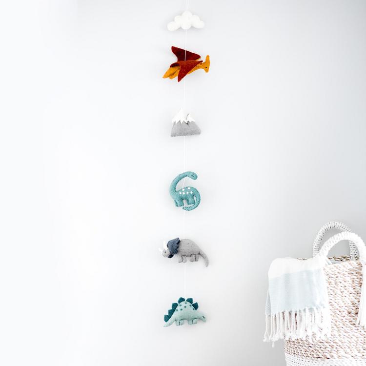 Add a playful prehistoric touch to your child’s space with this handmade dinosaur garland. Featuring dinosaur shapes, this garland brings fun and character to nurseries, playrooms, and dinosaur-themed rooms while creating an imaginative and engaging environment. This handmade nursery garland is Fair Trade certified and crafted using nontoxic materials and ethical craftsmanship by skilled women artisans. Lightweight and easy to hang, it is perfect for nursery wall décor, dinosaur theme nurseries, and gender-neutral baby rooms. Each piece is carefully made, making it a meaningful addition to your child’s space.