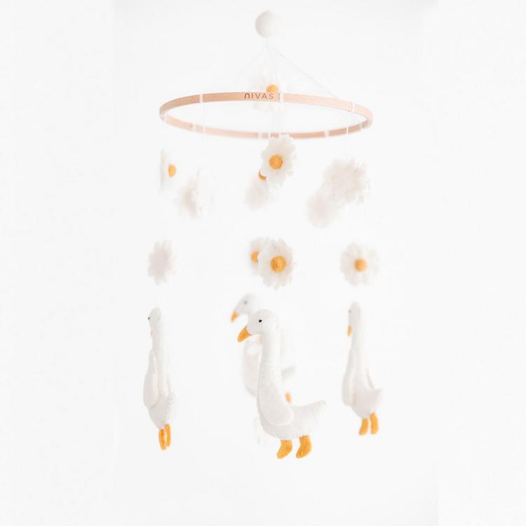 Bring a gentle nature-inspired touch to your baby’s nursery with this handmade duck and daisy baby mobile. Featuring sweet duck figures paired with delicate daisies, this crib mobile creates soft overhead movement while complementing duck theme nurseries, garden nurseries, floral nurseries, and gender-neutral baby rooms. Each handmade nursery mobile is Fair Trade certified and comes ready to hang with a sturdy cotton loop for easy display above a crib, bassinet, or changing table. Additional hanging hardware or crib arm not included. Due to the handmade nature of this baby mobile, colors and sizes may vary slightly, making each piece unique.