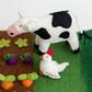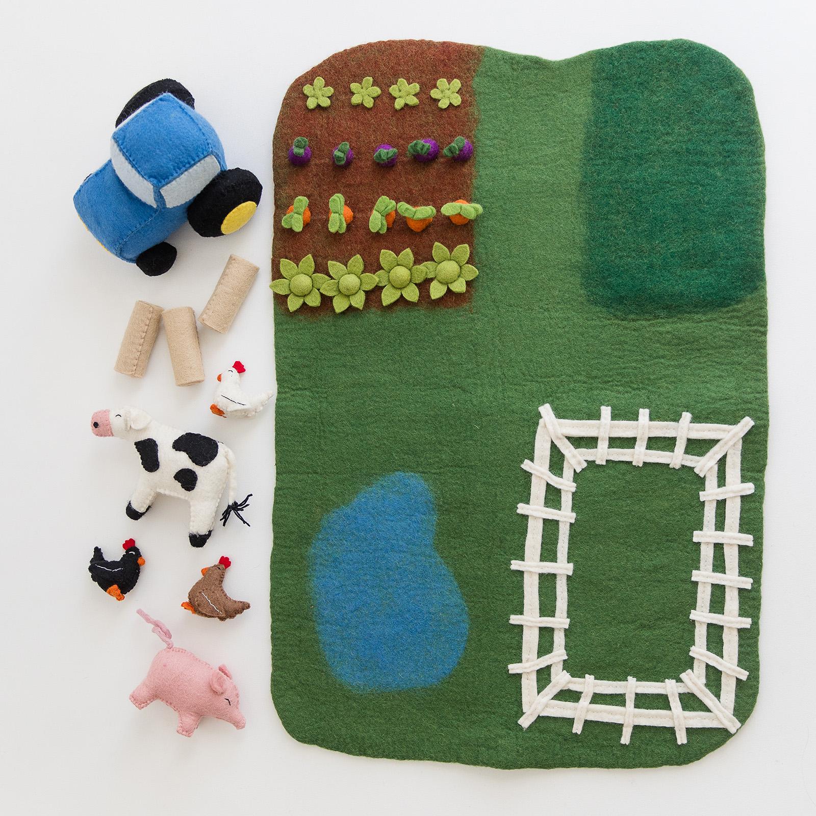 Bring farm life to playtime with this handmade farm play mat and toy set. Featuring a farm-themed play mat, this set includes 3 chickens, 1 pig, 1 cow, 1 tractor, and hay for imaginative storytelling and pretend play. Children can create their own farm scenes while developing fine motor skills, creativity, and early learning through hands-on play. This handmade play mat set is Fair Trade certified and crafted using nontoxic materials, including Azo-free dyes, and ethical craftsmanship. Ideal for toddler play, Montessori learning, travel play, and preschool activities, it provides an engaging space for open-ended play. Perfect for farm theme playrooms and animal lovers.