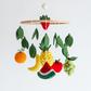 Bring a colorful and playful touch to your baby’s nursery with this handmade fruits baby mobile. Featuring a variety of fruit shapes, this crib mobile creates gentle overhead movement while complementing fruit theme nurseries, food theme nurseries, kitchen theme nurseries, and gender-neutral baby rooms. Each handmade nursery mobile comes is Fair Trade certified and ready to hang with a sturdy cotton loop for easy display above a crib, bassinet, or changing table. Additional hanging hardware or crib arm not included. Due to the handmade nature of this baby mobile, colors and sizes may vary slightly, making each piece unique.