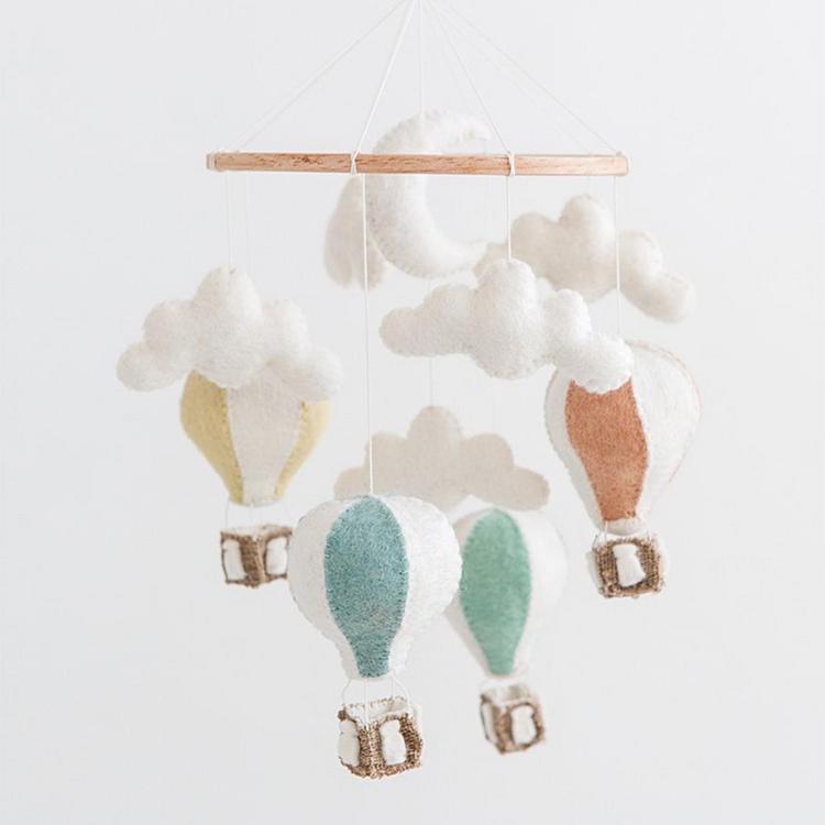 Add a whimsical and calming element to your baby’s nursery with this handmade hot air balloon baby mobile. Featuring floating hot air balloons and soft neutral tones, this crib mobile creates gentle overhead movement while complementing nursery décor, travel theme nurseries, and gender-neutral baby rooms. Each handmade nursery mobile is Fair Trade certified and comes ready to hang with a sturdy cotton loop for easy display above a crib, bassinet, or changing table. Additional hanging hardware or crib arm not included. Due to the handmade nature of this baby mobile, colors and sizes may vary slightly, making each piece unique.