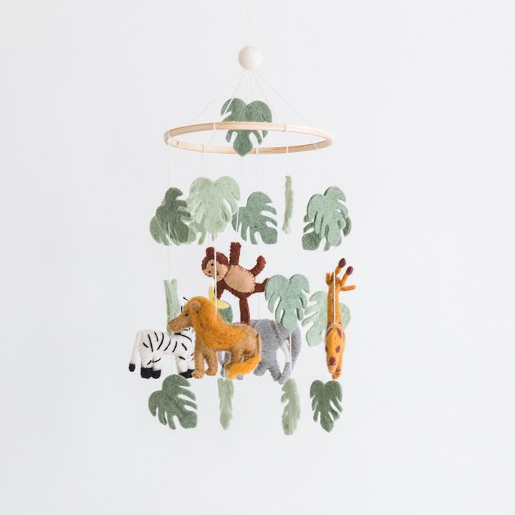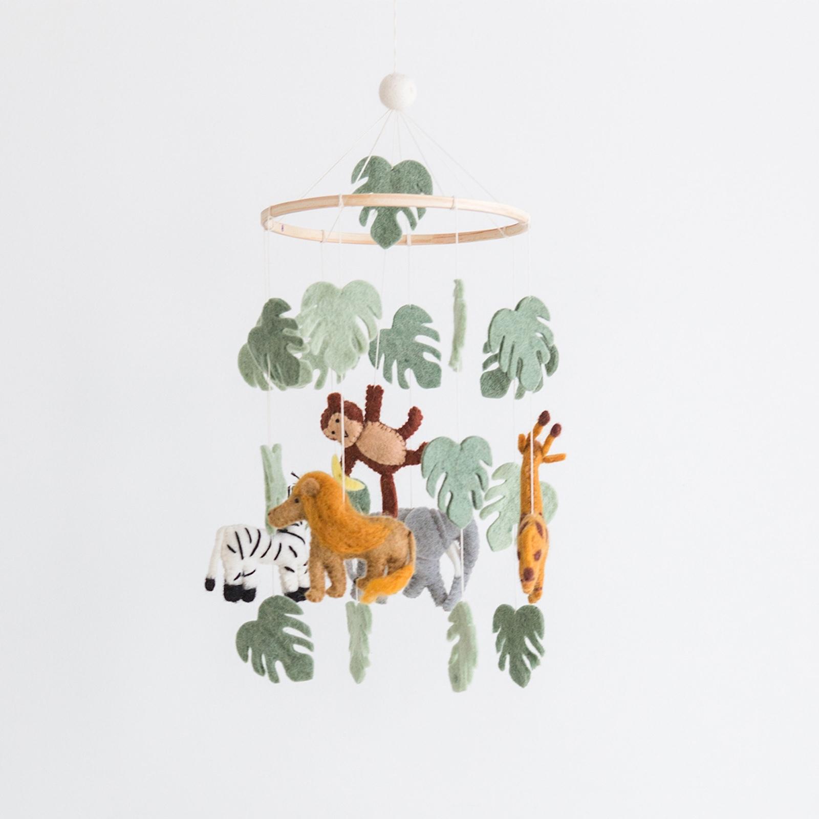 This safari baby mobile supports visual development while adding a modern touch to jungle theme nurseries, safari nurseries, and gender-neutral baby rooms. Featuring handmade safari animals, this crib mobile creates gentle movement that encourages visual tracking. Each handmade nursery mobile is Fair Trade certified and comes ready to hang with a sturdy cotton loop for easy display above a crib, bassinet, or changing table. Additional hanging hardware or crib arm not included. Due to the handmade nature of this baby mobile, colors and sizes may vary slightly, making each piece unique.