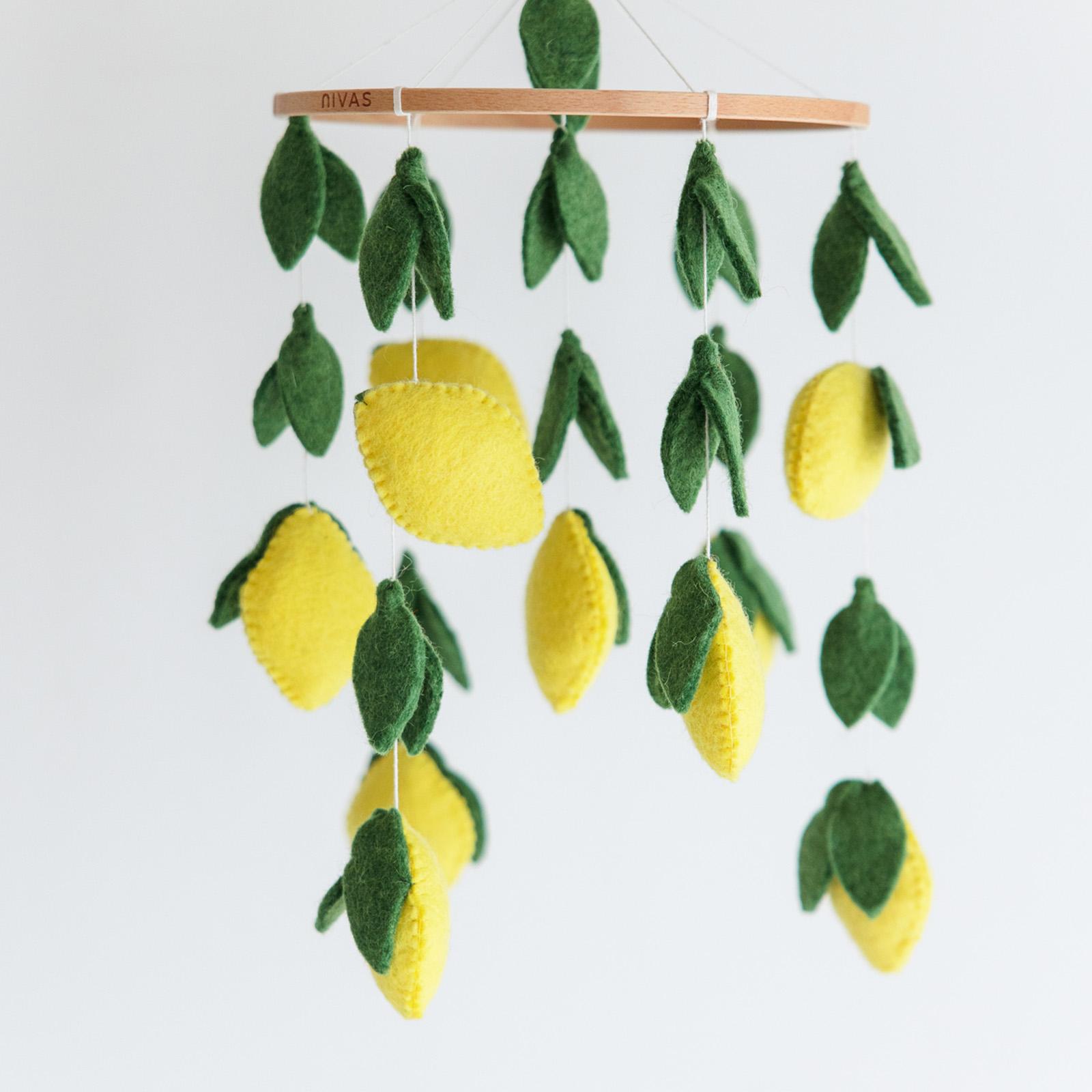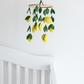 Add a fresh and cheerful touch to your baby’s nursery with this handmade lemon baby mobile. Featuring bright lemons and soft nature-inspired elements, this crib mobile creates gentle overhead movement while complementing citrus theme nurseries, fruit nurseries, garden nurseries, and gender-neutral baby rooms. Each handmade nursery mobile is Fair Trade certified and comes ready to hang with a sturdy cotton loop for easy display above a crib, bassinet, or changing table. Additional hanging hardware or crib arm not included. Due to the handmade nature of this baby mobile, colors and sizes may vary slightly, making each piece unique.