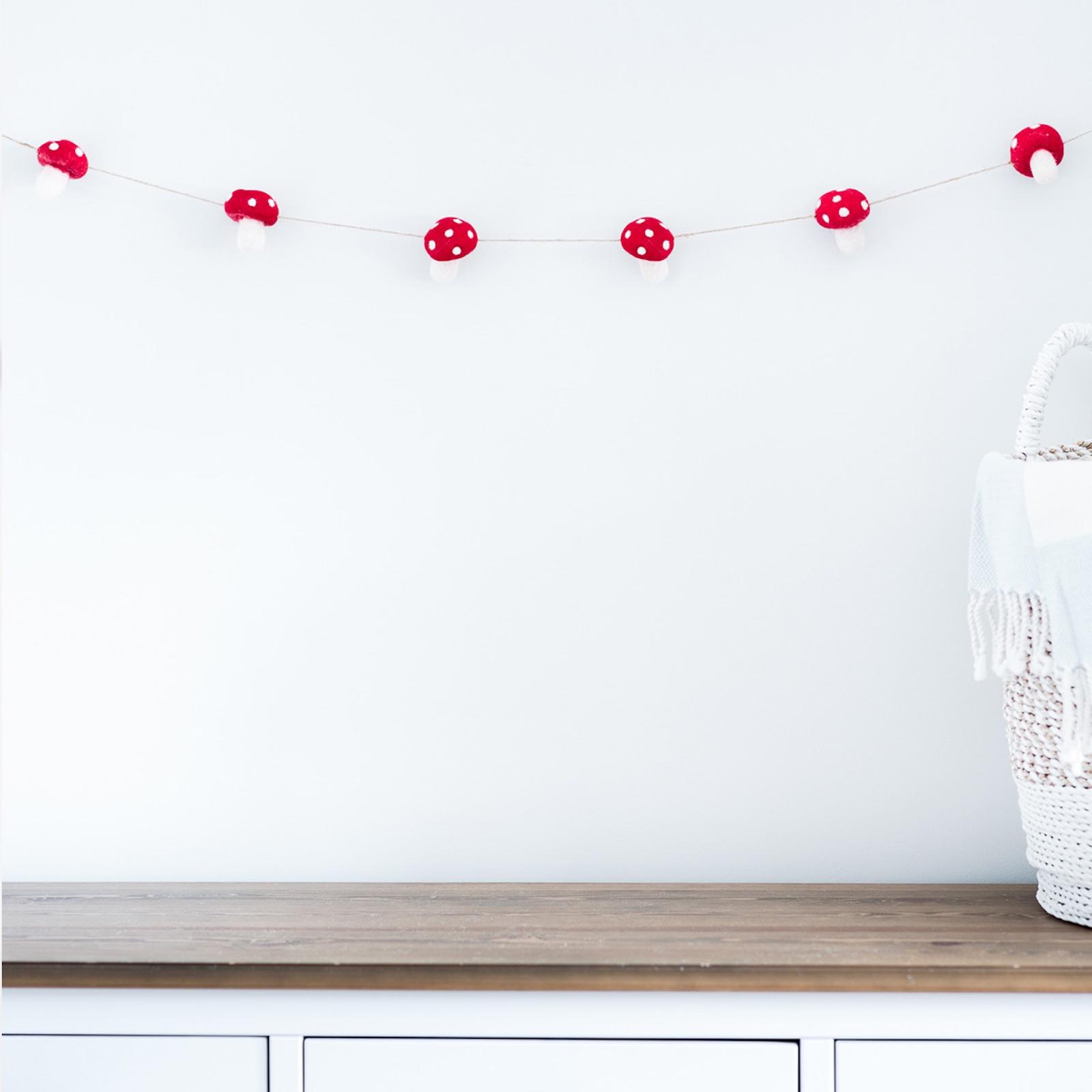 Add a whimsical woodland touch to your child’s space with this handmade mushroom garland. Featuring charming mushroom shapes, this garland brings warmth and playful character to nurseries, playrooms, and woodland-themed rooms while creating a cozy and imaginative environment. This handmade nursery garland is Fair Trade certified and crafted using nontoxic materials and ethical craftsmanship by skilled women artisans. Lightweight and easy to hang, it is perfect for nursery wall décor, woodland theme nurseries, forest nurseries, and gender-neutral baby rooms. Each piece is carefully made, making it a meaningful addition to your child’s space.