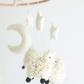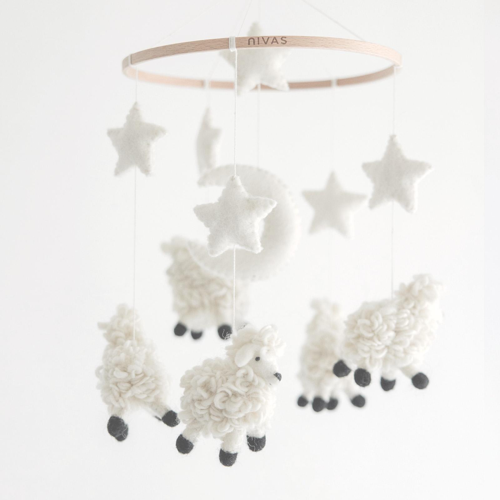 Create a calm and cozy nursery atmosphere with this handmade sheep baby mobile. Featuring sweet sheep and soft, soothing elements, this crib mobile adds gentle overhead movement while complementing farm theme nurseries, animal nurseries, neutral nursery décor, and gender-neutral baby rooms. Each handmade nursery mobile is Fair Trade certified and comes ready to hang with a sturdy cotton loop for easy display above a crib, bassinet, or changing table. Additional hanging hardware or crib arm not included. Due to the handmade nature of this baby mobile, colors and sizes may vary slightly, making each piece unique.