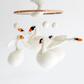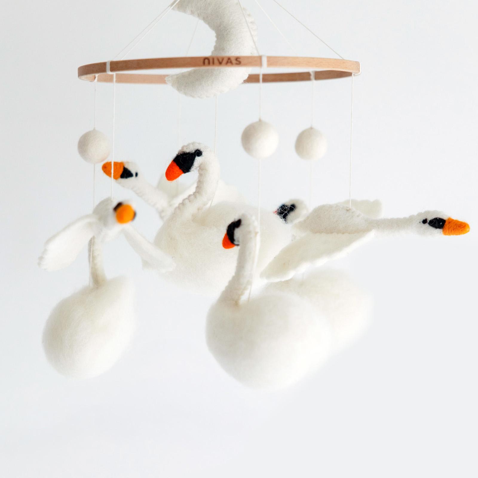 Create an elegant and peaceful focal point in your baby’s nursery with this handmade swan baby mobile. Featuring graceful swans and soft, flowing elements, this crib mobile creates gentle overhead movement while complementing swan theme nurseries, ballet nurseries, princess nurseries, and gender-neutral baby rooms. Each handmade nursery mobile is Fair Trade certified and comes ready to hang with a sturdy cotton loop for easy display above a crib, bassinet, or changing table. Additional hanging hardware or crib arm not included. Due to the handmade nature of this baby mobile, colors and sizes may vary slightly, making each piece unique.