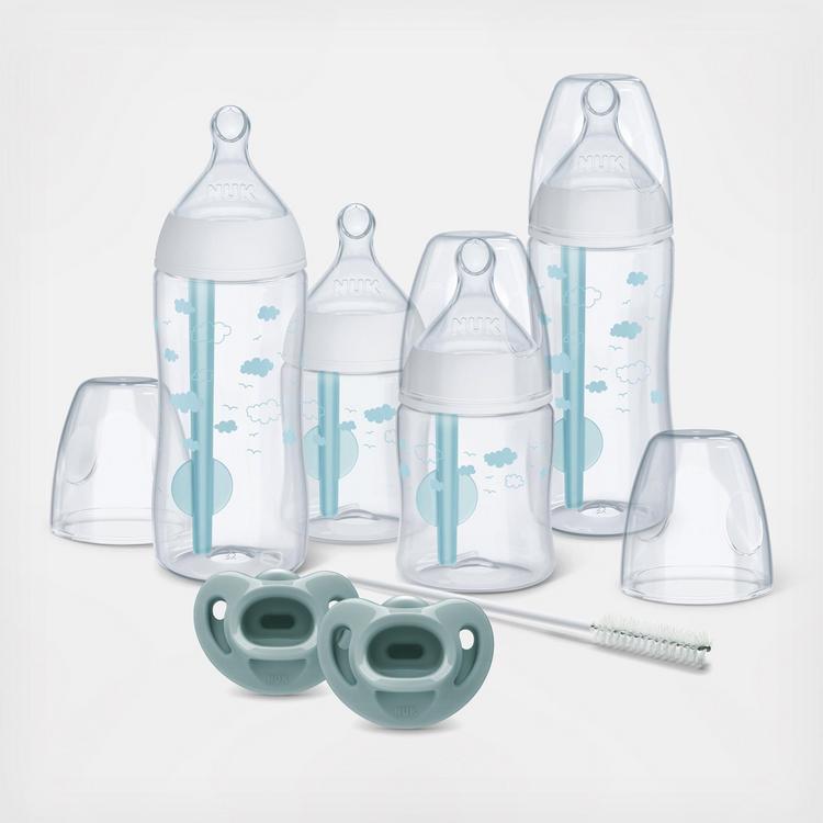 The Smooth Flow Pro Anti-Colic Baby Bottle & Pacifier Newborn Gift Set. The Smooth Flow Pro Anti-Colic Baby Bottle features an anti-colic venting system proven to reduce baby colic symptoms of gas, extensive crying, and reflux. With an advanced venting system minimizing air bubbles in the milk, baby swallows less air, reducing spit-up and burping. The Smooth Flow Pro Anti-Colic Bottle has fewer pieces than the leading anti-colic bottle, so it's easier to prep, assemble, and clean. And because the nipple and collar is only one piece, there are no leaks, guaranteed. Comfy Pacifiers are shaped and sized for newborns, and made with medical-grade silicone that's both soft and durable. A beautiful baby gift idea or baby registry gift.
