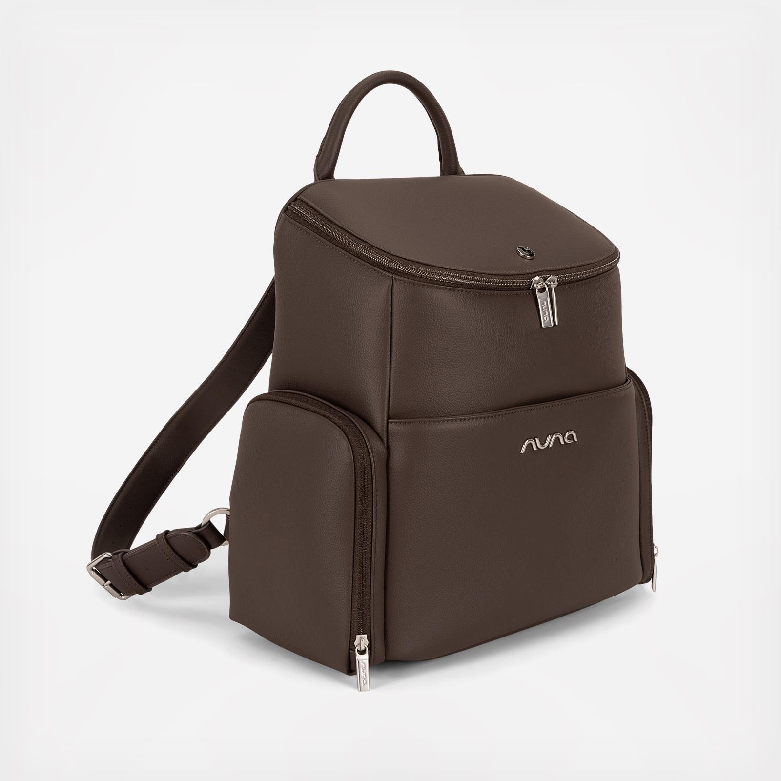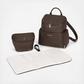 Backpackable Diaper bag with a stylish design and thoughtful features, including an insulated bottle bag and changing pad clutch that unfolds for a wipeable space to lay baby.