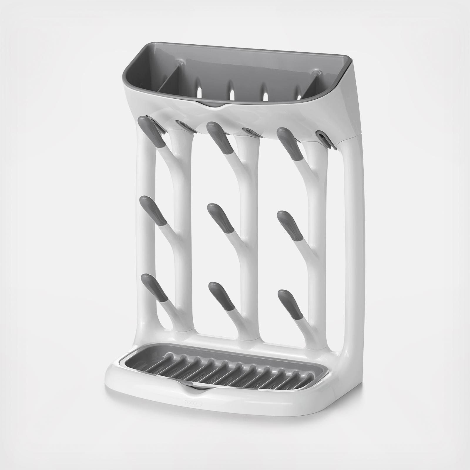 Use the OXO Tot Space Saving Drying Rack to dry baby bottles and sippy cups without taking up too much space. Compact design features 9 angled hooks for bottles and cups plus a removable top compartment for covers, nipples, and other small items. Removable drain tray.
