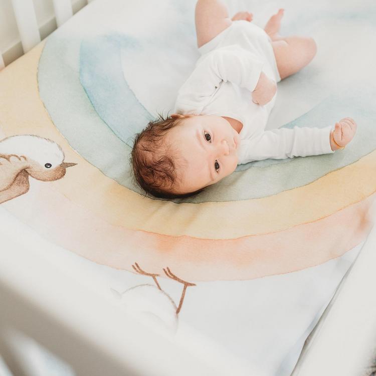 Illustrated with love by artist Nina Stajner, this watercolor rainbow design is as whimsical as it gets. Soft to the touch, sleeping on this 100% cotton sateen crib sheet is a dream. The high-quality fabric is made of 230 thread count and a sateen weave, which is known for its smooth and lustrous finish. Because we care about your little ones, the crib sheet is OEKO-TEX® certified and carefully crafted without harmful chemicals.
