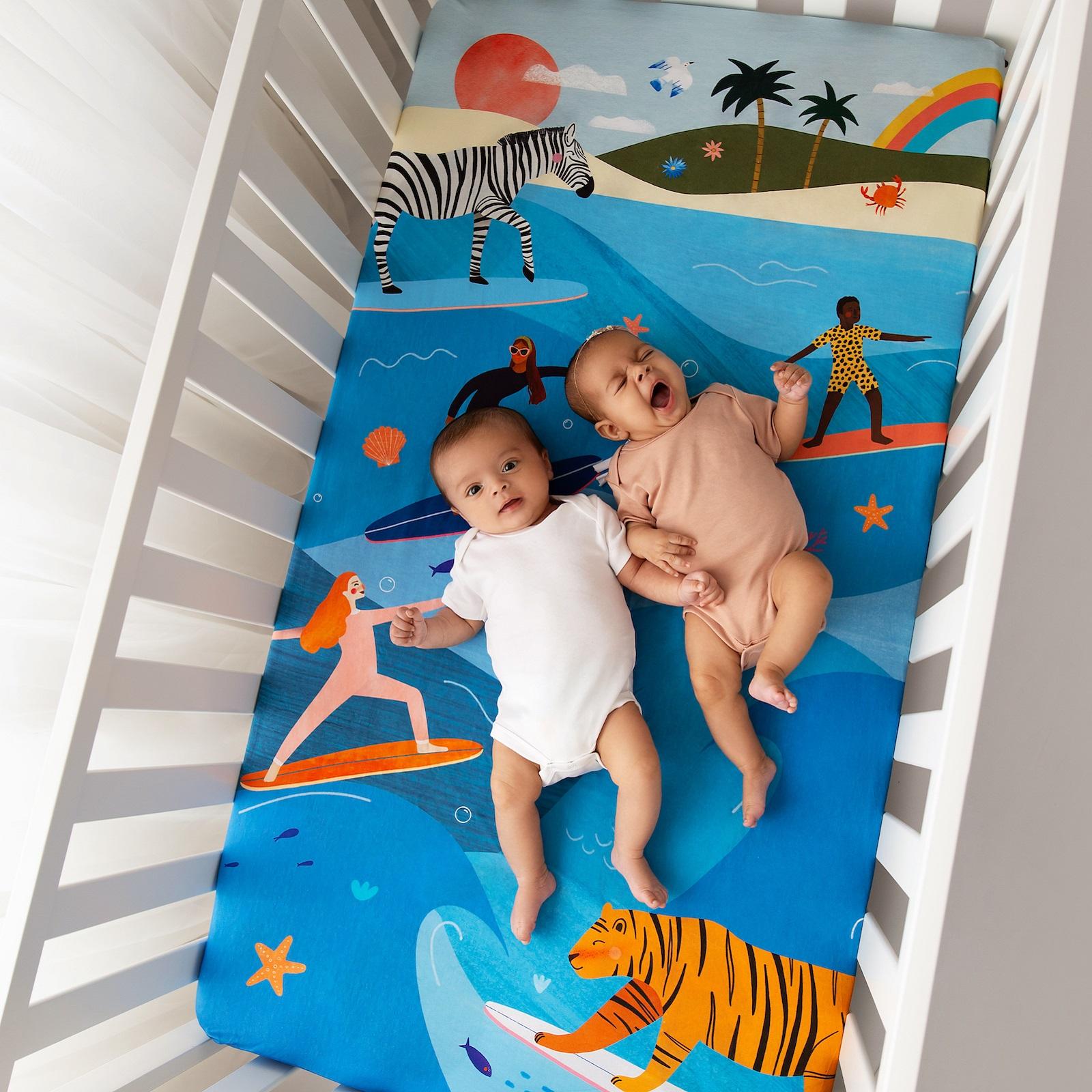 Illustrated with love by artist Laura L'Hullier, this fun crib sheet is the perfect accent for an ocean or surf themed nursery room. Soft to the touch, sleeping on this 100% cotton sateen crib sheet is a dream. The high-quality fabric is made of 230 thread count and a sateen weave, which is known for its smooth and lustrous finish. Because we care about your little ones, this crib sheet is OEKO-TEX® certified and carefully crafted without harmful chemicals.