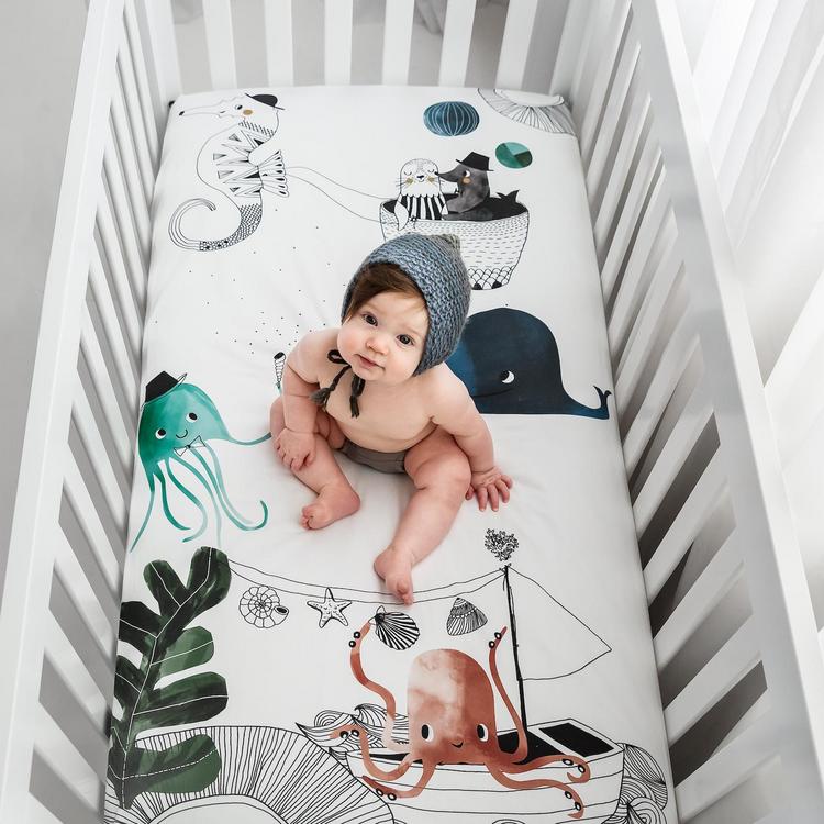 Illustrated with love by artist Swantje Hinrichsen, this crib sheet features beautiful touches of watercolor and a crew of sea-fairing friends. Soft to the touch, sleeping on this 100% cotton sateen crib sheet is a dream. The high-quality fabric is made of 230 thread count and a sateen weave, which is known for its smooth and lustrous finish. Because we care about your little ones, the crib sheet is OEKO-TEX® certified and carefully crafted without harmful chemicals.