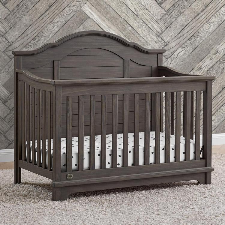 The elegant curves and shiplap-inspired headboard of the Asher 6-in-1 Convertible Baby Crib by Simmons Kids are brought to life with a lightly textured finish. A great option for your baby's nursery, this convertible crib features a dramatic silhouette that will make it the focal point of any bedroom for years to come. It's grow-with-me design features three adjustable height levels that allow the crib to be lowered as your child grows, plus it converts from a crib, to a toddler bed, sofa, daybed, full size bed with headboard or full size bed with headboard and footboard. The only bed your little one will ever need, this versatile crib will take you from the nursery to high school, and all the years in between. Toddler Guardrail included; Full Size Bed Rails sold separately. Given the hand applied nature of this baby crib’s finish, variations in the wood are to be expected and celebrated.
