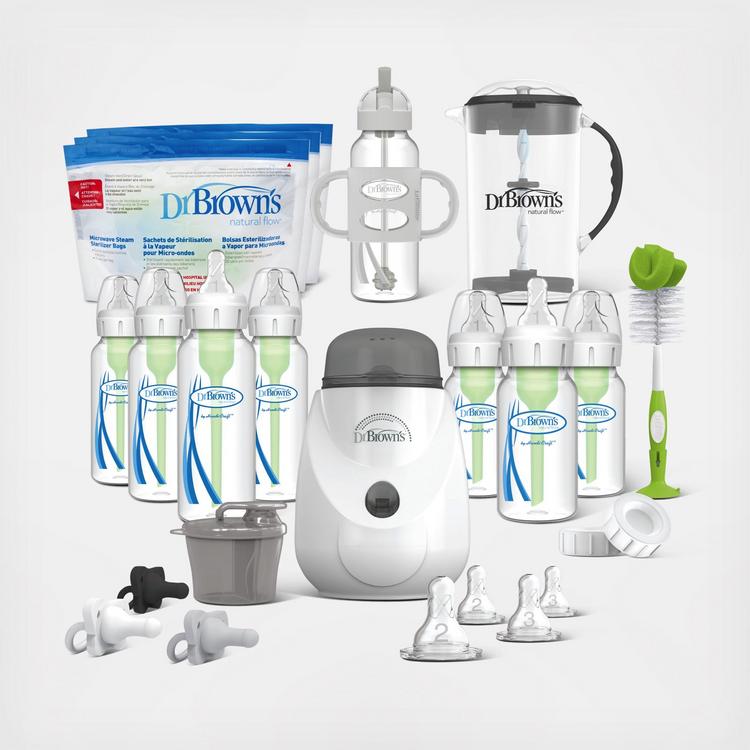 Everything you need for happy feeding! Dr. Brown’s Natural Flow® Anti-Colic Options+™ All-In-One Gift Set has mom and baby covered from soothing to feeding to bottle cleaning. The anti-colic internal vent system is clinically proven to reduce colic. Dr. Brown’s bottles provide a more comfortable feeding experience for baby by decreasing spit-up, burping and gas. This vacuum-free feeding is closest to breastfeeding and Dr. Brown’s silicone nipples provide a consistent flow so baby can feed at their own pace. The breast-like nipple shape encourages a proper latch for a more natural bottle feeding experience and eases the transition from breast to bottle and back again. Dr. Brown’s vent system is proven to help preserve bottle milk nutrients and aids in digestion for a better night’s sleep. The silicone nipple, together with the internal vent system, offer a reliable and trusted bottle feeding experience that makes Dr. Brown’s the #1 Pediatrician recommended baby bottle in the U.S. Made to grow with baby, our bottle is designed to nourish through all of baby’s feeding stages and is recyclable.