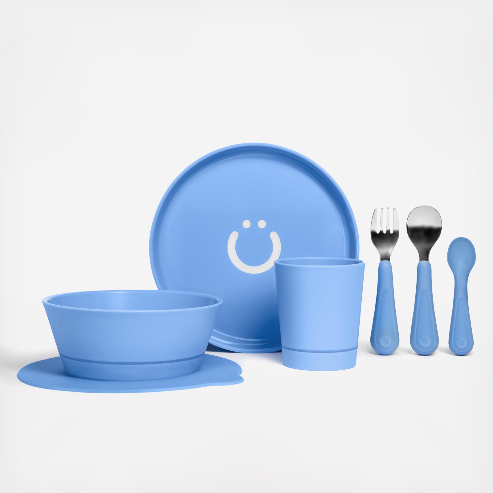 Dimensions: plate: 7 x 7 in.; bowl: 5.6 x 5.6 in.; cup: 2.9 x 3.3 in.; fork: 5 x 0.8 in.; spoon: 5 x 0.8 in.; silicone spoon: 4 x 0.8 in.; interchangeable suction cup: 7.5 x 7 in.; overall: 2.75 x 11.62 x 7.62 in.