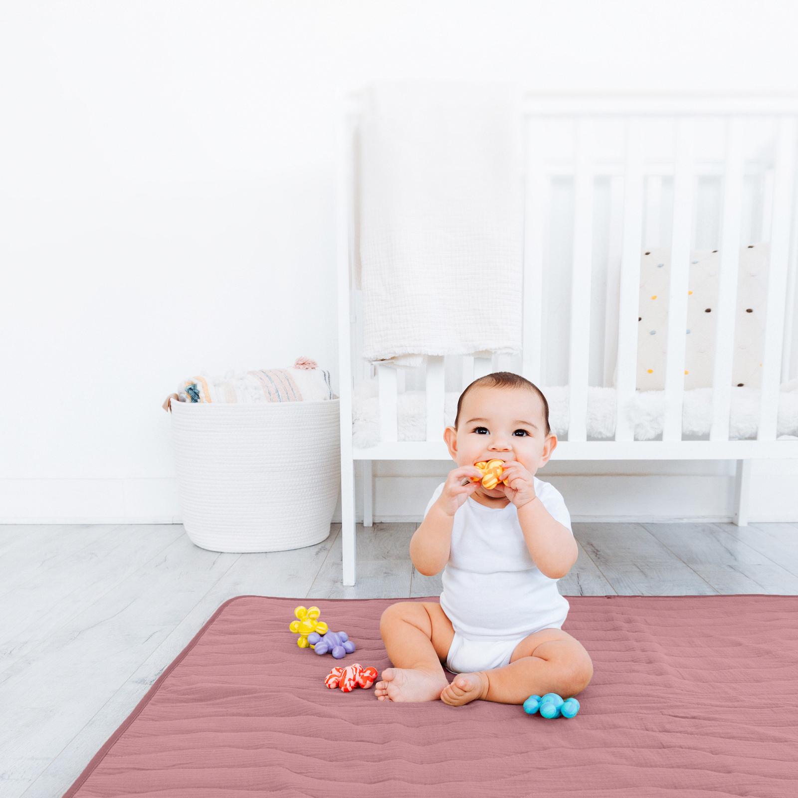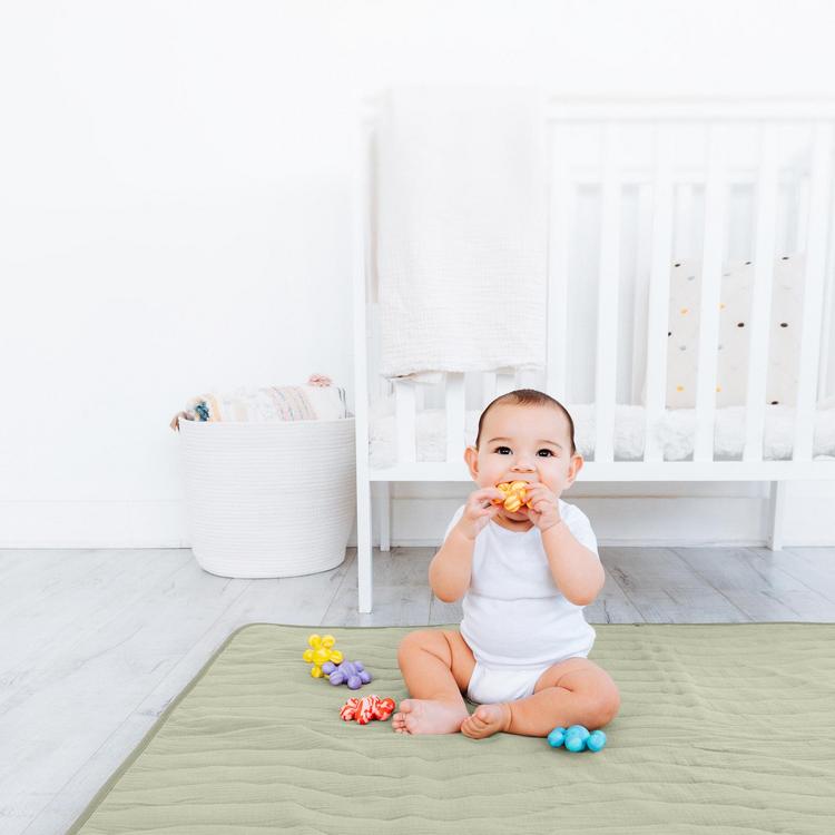 Give your little one a cozy and safe space to play, crawl, and explore with the Ubbi Baby Floor Mat. Thoughtfully designed with a thick foam pad for superior comfort, this play mat features an ultra-soft 100% cotton muslin cover that is gentle on baby’s skin. This machine-washable cover ensures easy cleaning, while the non-slip foam cushion backing keeps the mat securely in place on any floor surface. Providing ample space for baby play time, crawling, tummy time, changing clothes, diaper changes, sitting, baby’s first steps, and more. Plus, the foldable design and easy-to-clean washable fabric cover make it easy to store or take on the go. This versatile mat blends seamlessly into any nursery or living space. Designed with parents and children in mind providing a functional, innovative solution for modern parents.