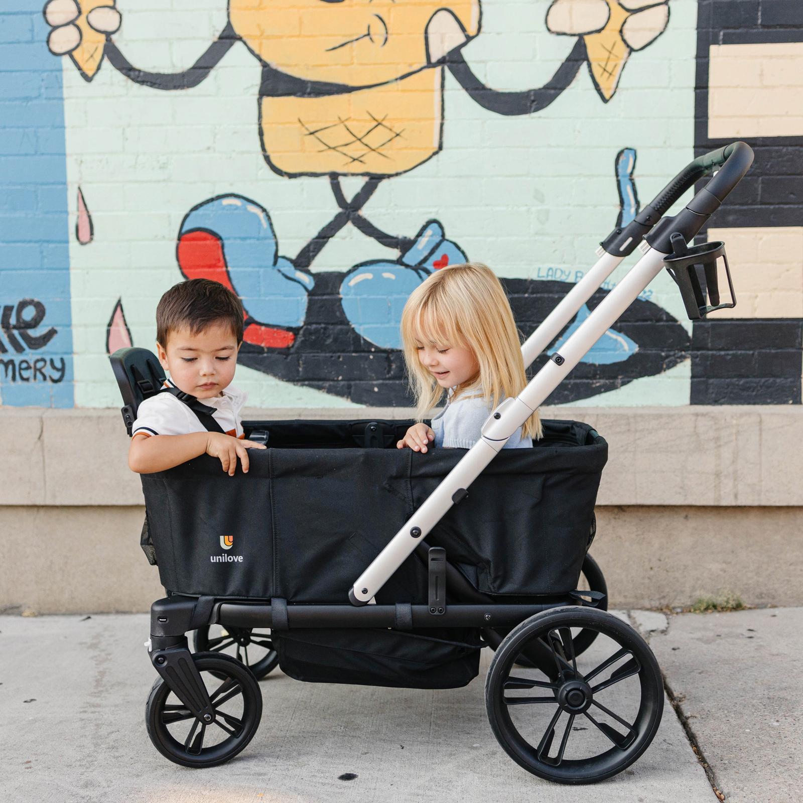 Trio Trolly convertible stroller 2-seat wagon easily transforms between stroller and wagon modes, offering up to 31 seating combinations for newborns and toddlers. A deep footwell and reversible seats keep little ones comfortable, while the 3-level adjustable handlebar and all-terrain wheels make every ride smooth. Designed with a full-size canopy and generous storage, it’s perfect for family adventures, indoors or outdoors. Max Capacity: 55 lb per seat.